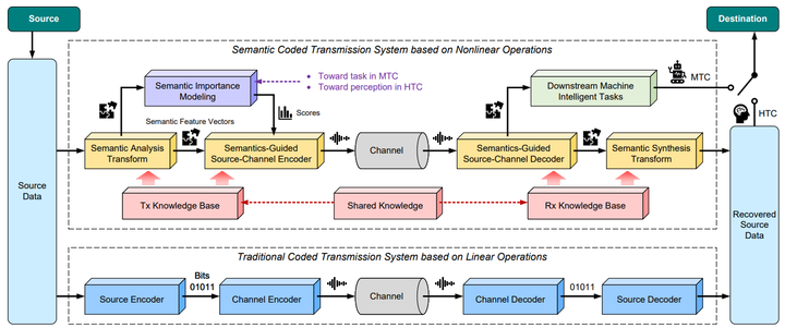 Classical communication paradigms focus on accurately transmitting bits over a noisy channel, and Shannon theory provides a fundamental theoretical limit on the rate of reliable communications. In this approach, bits are treated equally, and the communication system is oblivious to what meaning these bits convey or how they would be used. Future communications towards intelligence and conciseness will predictably play a dominant role, and the proliferation of connected intelligent agents requires a radical rethinking of coded transmission paradigm to support the new communication morphology on the horizon. The recent concept of “semantic communications” offers a promising research direction. Injecting semantic guidance into the coded transmission design to achieve semantics-aware communications shows great potential for further breakthrough in effectiveness and reliability. This article sheds light on semantics-guided source and channel coding as a transmission paradigm of semantic communications, which exploits both data semantics diversity and wireless channel diversity together to boost the whole system performance. We present the general system architecture and key techniques, and indicate some open issues on this topic.
