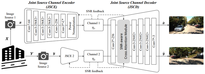 We study the problem of deep joint source-channel coding (D-JSCC) for correlated image sources, where each source is transmitted through a noisy independent channel to the common receiver. In particular, we consider a pair of images captured by two cameras with probably overlapping fields of view transmitted over wireless channels and reconstructed in the center node. The challenging problem involves designing a practical code to utilize both source and channel correlations to improve transmission efficiency without additional transmission overhead. To tackle this, we need to consider the common information across two stereo images as well as the differences between two transmission channels. In this case, we propose a deep neural networks solution that includes lightweight edge encoders and a powerful center decoder. Besides, in the decoder, we propose a novel channel state information aware cross attention module to highlight the overlapping fields and leverage the relevance between two noisy feature maps. Our results show the impressive improvement of reconstruction quality in both links by exploiting the noisy representations of the other link. Moreover, the proposed scheme shows competitive results compared to the separated schemes with capacity-achieving channel codes.